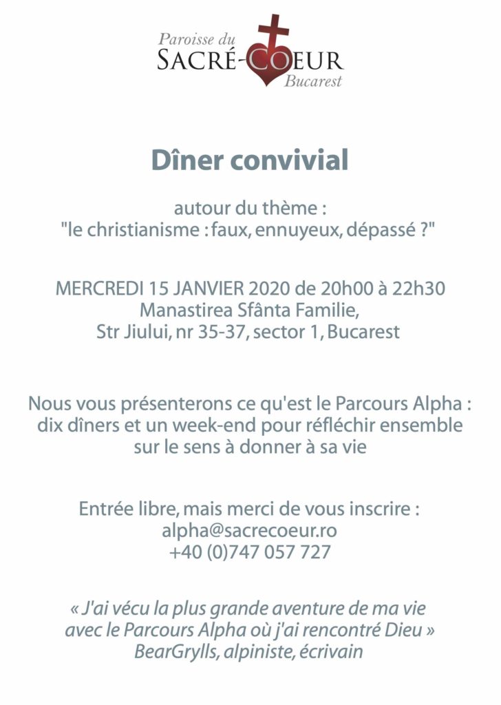 Un parcours Alpha est une série de repas, ouverts à tous, où chacun peut venir s’interroger avec d’autres sur le sens de la vie autour d’un repas convivial. Les parcours Alpha proposent à tous ceux qui le souhaitent de s’interroger sur les questions essentielles de la vie (Dieu, la foi, le sens de la vie, la relation de couple, l’engagement, …). C’est une opportunité de découvrir ou redécouvrir les bases de la foi chrétienne en 10 rencontres et un week end. C’est sans engagement, informel et convivial.