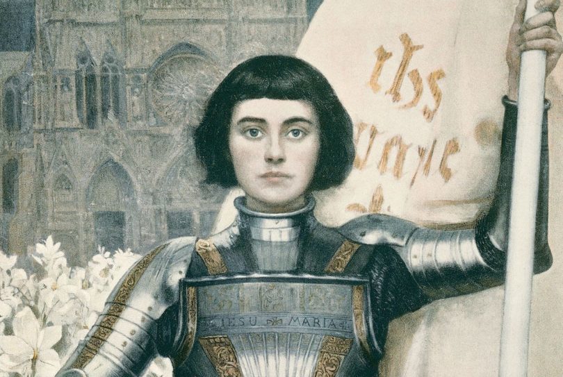 À la vigueur de Jeanne s’unit une foi profonde, une piété sincère et démonstrative. Partout elle a ses chapelains, elle se confesse fréquemment, communie aussi souvent qu’elle peut. Si elle aime son épée, elle préfère « quarante fois » son étendard, où sont brodés les noms de Jésus et de Marie.
